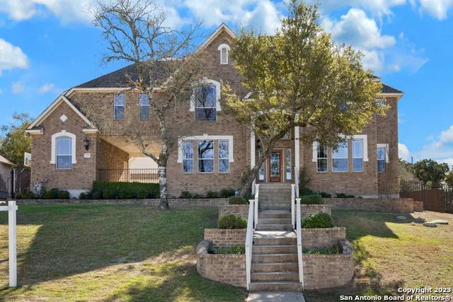 Come see this beautiful home with 4 bedrooms, 3 full baths and 2 half baths, high ceilings, amazing kitchen with granite counter tops, formal dining room, gorgeous open living room with fireplace, in addition to a media room and a game room upstairs! Beautiful hardwood floors, home office, majestic stairs, covered outdoor living space with outdoor kitchen along with separate dog run. A lovely wrought iron gated driveway brings you to the courtyard with One- three car garage and One-single car garage for a total of 4. Great basketball area. Relax on your deck with pool and attached hot tub while entertaining and enjoying the Texas Hill Country! Lot backs up to large residential tract in bordering neighborhood. New 2023 AC unit, 2nd unit has new 2023 condenser. Master suite downstairs.