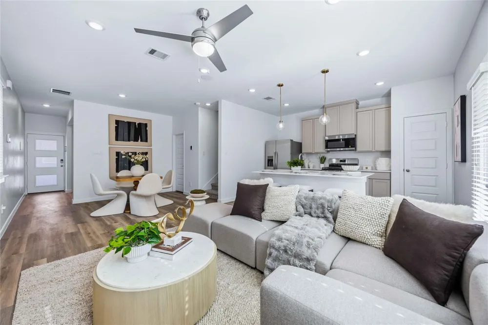 Welcome to the Gardenia floor plan—a modern two-story home with 1,384 sq. ft. and a spacious two-car garage. The front foyer opens to an airy dining, living, and kitchen area with a stylish island for extra storage and seating. A convenient half bath sits off the dining area. Step outside to a covered patio and outdoor storage unit. Upstairs features a laundry room with shelving, two secondary bedrooms with walk-in closets, and a full bath with a standing tub and single vanity. The private primary suite includes a two-sink vanity, standing shower, and large walk-in closet. The Gardenia offers smart design, comfort, and convenience—your ideal next home.